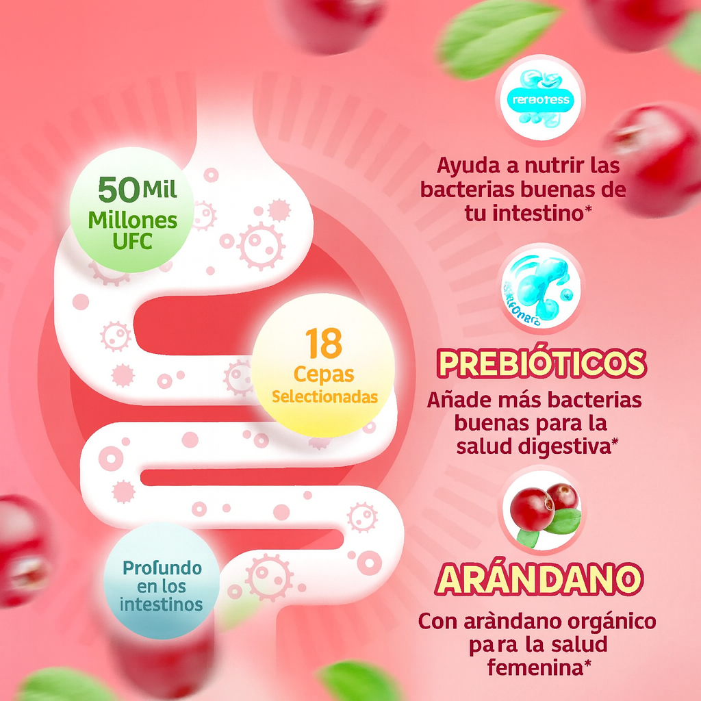 Nuestras gomitas tienen 50 mil millones de probióticos, 18 cepas seleccionadas y arándano orgánico que trabajan desde tu intestino.