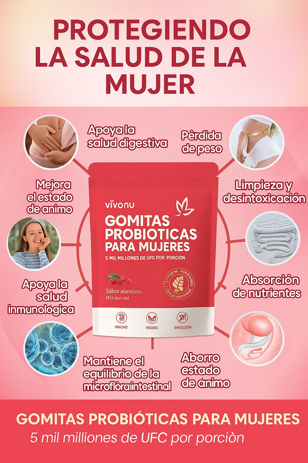Con nuestras Gomitas Probióticas para Mujeres (5 mil millones de UFC), disfrutas de un apoyo natural para tu salud íntima, defensas e intestino.