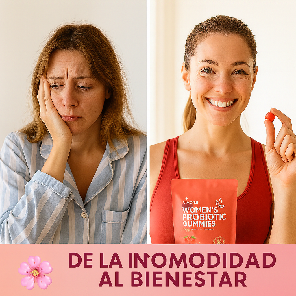 A la derecha, con nuestras Gomitas Probióticas para Mujeres, recuperas el equilibrio íntimo, la digestión ligera y la confianza que mereces.